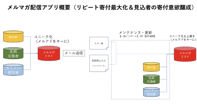 こういった情報を1つのリストにまとめて全属性にメルマガを一斉配信する、あるいは属性別にメール配信する、こういった運用ができるだけで、寄付増収および活動のファン度を高めることができます。