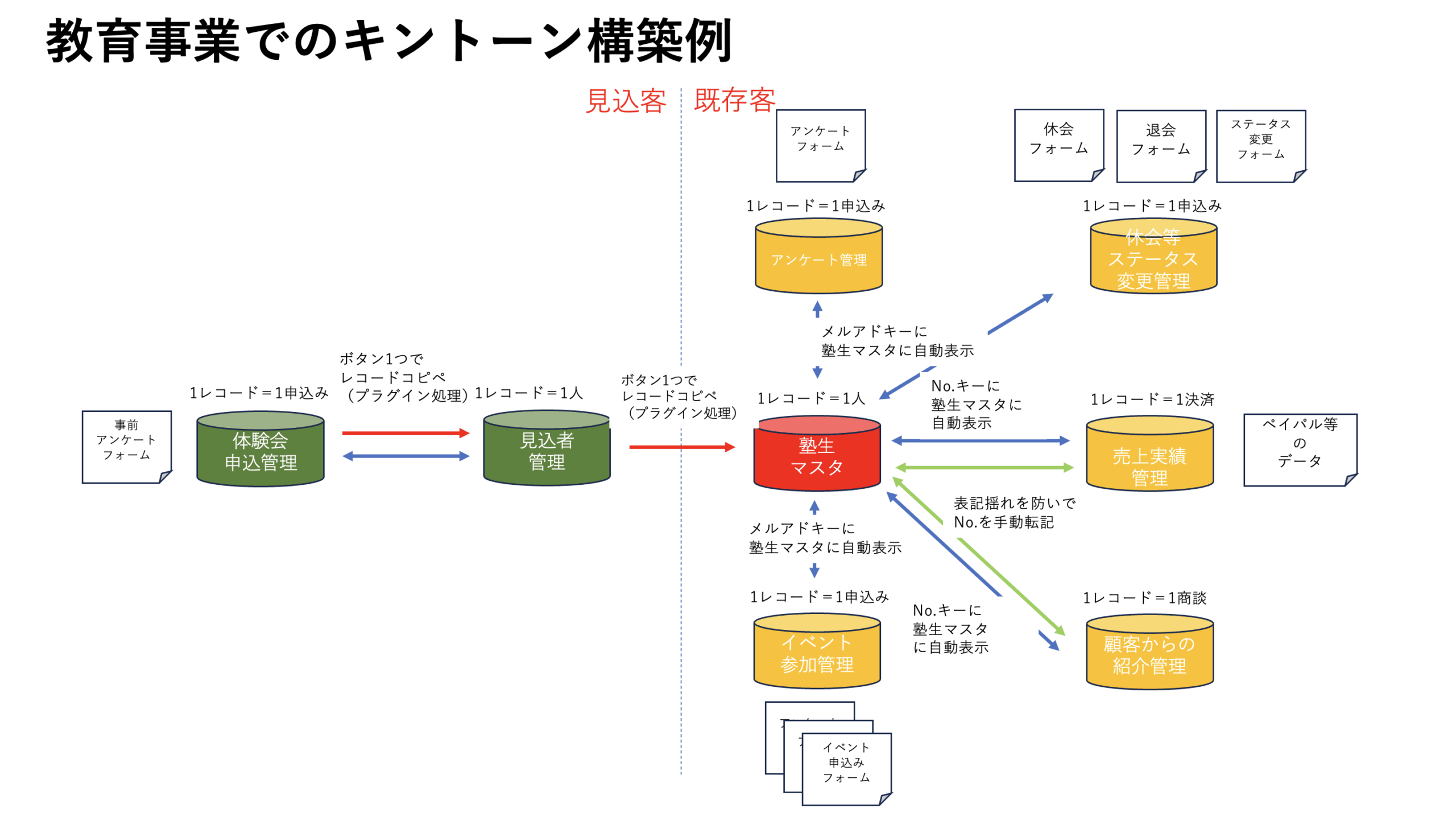 そこを、キントーン(kintone)で常に見込客、既存客情報を集約する体制にすることで、リスクを回避して、情報をストックして活用できる体制を担保しながら、法人活動を続けることができるようになるのです。