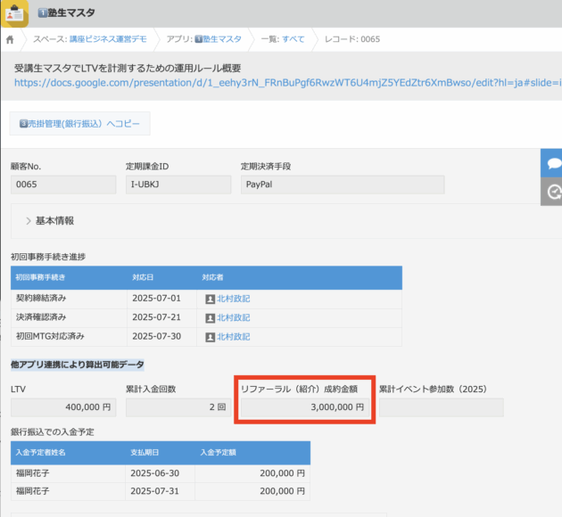 そして、塾生が紹介してくれるごとに、「顧客からの紹介管理」で紹介してくれた情報を入力すると、自動的に塾生マスタにも紹介情報が反映され、どの塾生がどれくらい紹介してくれたか?を分かるようになります。