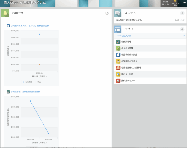 案件の進捗、売上見込み、人員稼働状況などがスペース上で即時に見える。