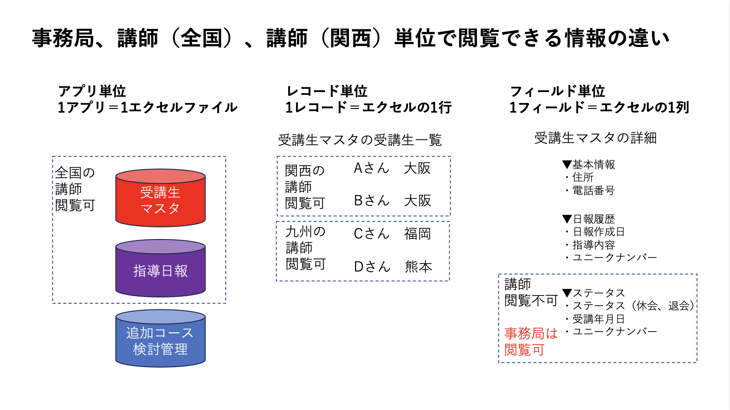 キントーンはエクセルでいうファイル単位、行単位、列単位で立場の違いによって情報を出し分ける機能を実装することができます。