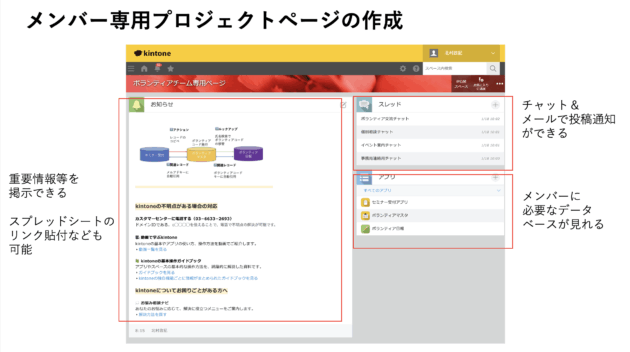 例えば、以下のようにキントーンのスペース機能を実装すれば、ボランティアチーム単位やプロジェクト単位で、特定の人だけが閲覧できるプチホームページのようなものを作成し、経営に必要な情報を一箇所に集めつつ、属人化を防ぐことができます。