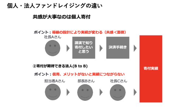 寄付集めは共感が大事という言葉を聞かれた方はいらっしゃるかと思いますが、共感が大事なのは個人に対するファンドレイジングであって、法人に対するファンドレイジングは、一般的なサービスを提供する場合の法人営業と全く同じ性質があり、実績、信用、メリットがないと法人との取引はできません。