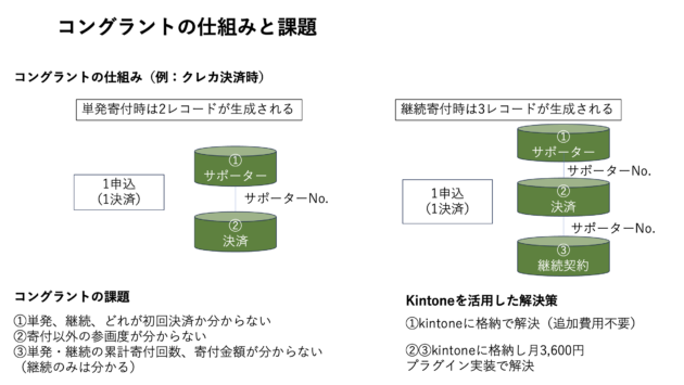 例えば、寄付金管理においても、以下のような課題がコングラントにはあり、キントーン(kintone)が補完できます。