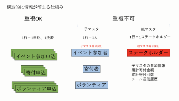 多くのNPOでは以下の情報がExcelやスプレッドシートで管理されています。