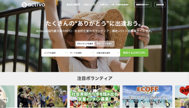 activo(アクティボ)は、NPO、NGO、社会的企業がボランティアや職員・アルバイトを募集できる、登録団体数1万件超の日本最大級のボランティア・求人情報プラットフォームです。