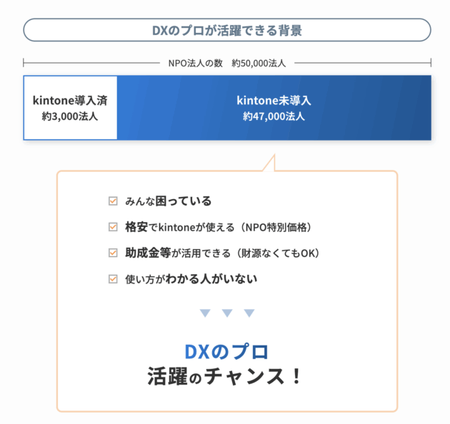 - 非営利団体も営利企業へもキントーン(kintone)提案を行う事でやりがいと適正収入をバランスさせる