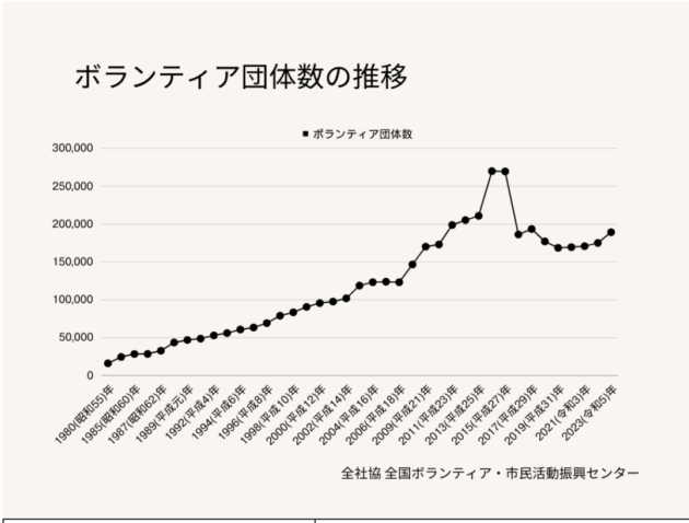 一方で、ボランティアを募集している団体数は、約20万団体と、年々逓増傾向にあります。