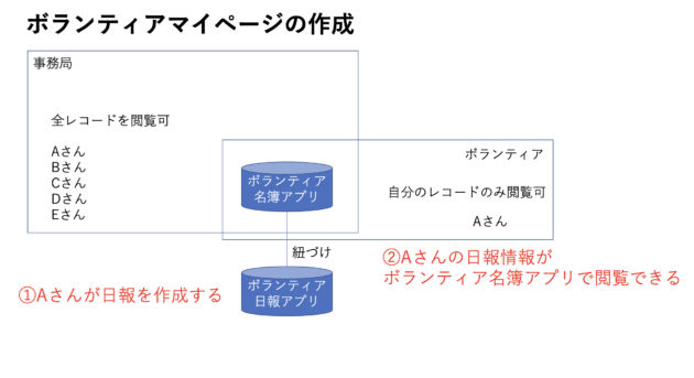 の2つのアプリ(=エクセルでいう2ファイル)を作成し、ボランティア名簿をみることで