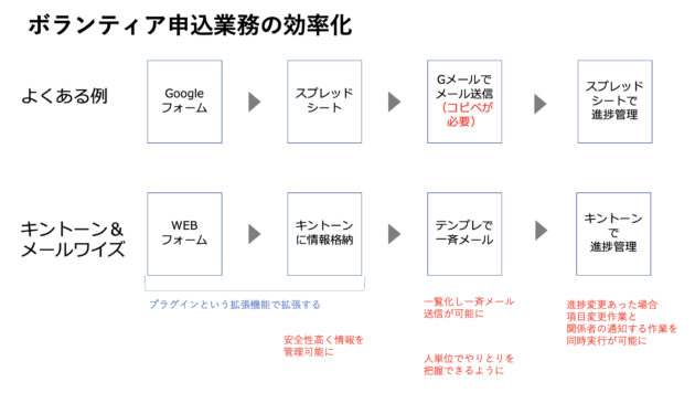 あとは、キントーンやガルーンで適切に初期構築や内製化するまでの期間を伴走できる、人材がいるだけで、最適なボランティア管理システムが構築できます